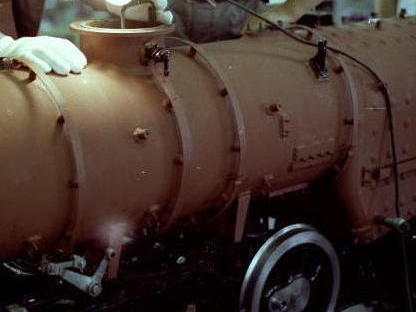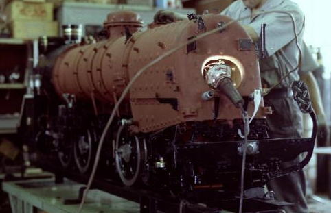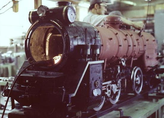 開業から1年の4月に、ボイラーの法定点検を兼ねる 車検のため、山手線大井町駅に隣接する国鉄 大井町工場へ持ち込まれた。 ※現在の「東京総合車輌センター」 我々学生運転手の見学要望に対し、初めての車検と いうこともあって、大井工場側の配慮で、貴重な 車検の様子を見学させていただく機会に恵まれた。 本物同様にボイラーがむき出しとなっている状態での 検査の様子から、各部品(安全弁、加減弁、ピストン 等)が解体され磨きあげられた状況、車輪の磨耗 調整のため研磨作業が行われているところなどを、 解説付きで見させていただいた。 併せて、本物の電車(103系、115系)の車検現場 にも入れていただき、車検のためバラされている台車 の実物を前に、旧性能(吊り掛け式)から進化した 新性能方式の駆動構造の違いについて、とても 丁寧に説明をしていただいたことを思い出した。 大井工場といえば、昭和天皇「御料車」の保管場所でも知られており、敷地の隅に1編成分独立したグレーの建屋があるのを案内いただき、そこが「御料車」の収められている車庫であることを、そっと教えていただいた。 |