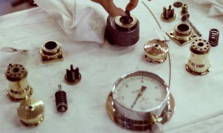 ![]() ![]() つまんでいるのが「加減弁」↓左右にはばらされて磨き上げられた「安全弁」、キャブ天井からはずされた「蒸気圧計」までもピカピカです