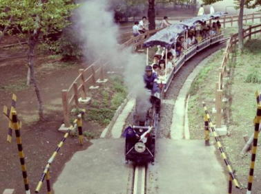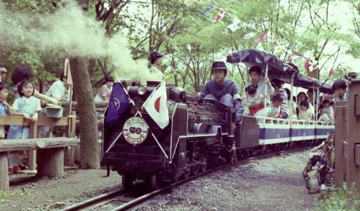1983年 5月2日 車検を終え新品同然に リフレッシュされた機関車が戻り 「チビクロ号」開業1周年の 記念運転が行われた。 ←公園内陸橋からの、 ハイアングルショット |