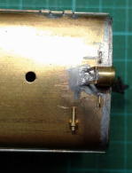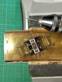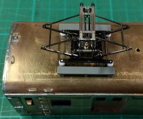 パンタをセンター留め↓現物合わせで、碍子の差し込み穴を開けます パンタ下部を削り高さを合わせ↓ランボードの爪を取り除きます