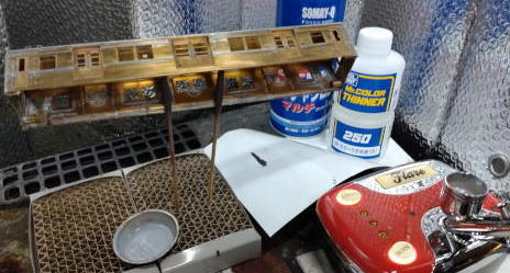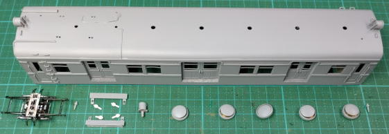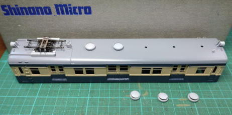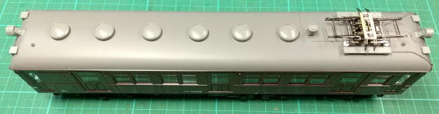 ボディ塗装↓ミッチャクロンを吹き⇒半乾きでサーフェーサー塗布 避雷器・ベンチレター・ランボード・信号炎管↓塗装