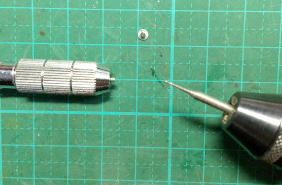 (釘を適当な長さに切断後↓ドリルチャックでくわえ、ルーターで板厚近くに削り出し)