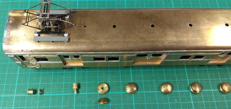 正面中央窓下↓通風孔の取付け 屋根上機器↓ヘッドランプ、避雷器、ベンチレター